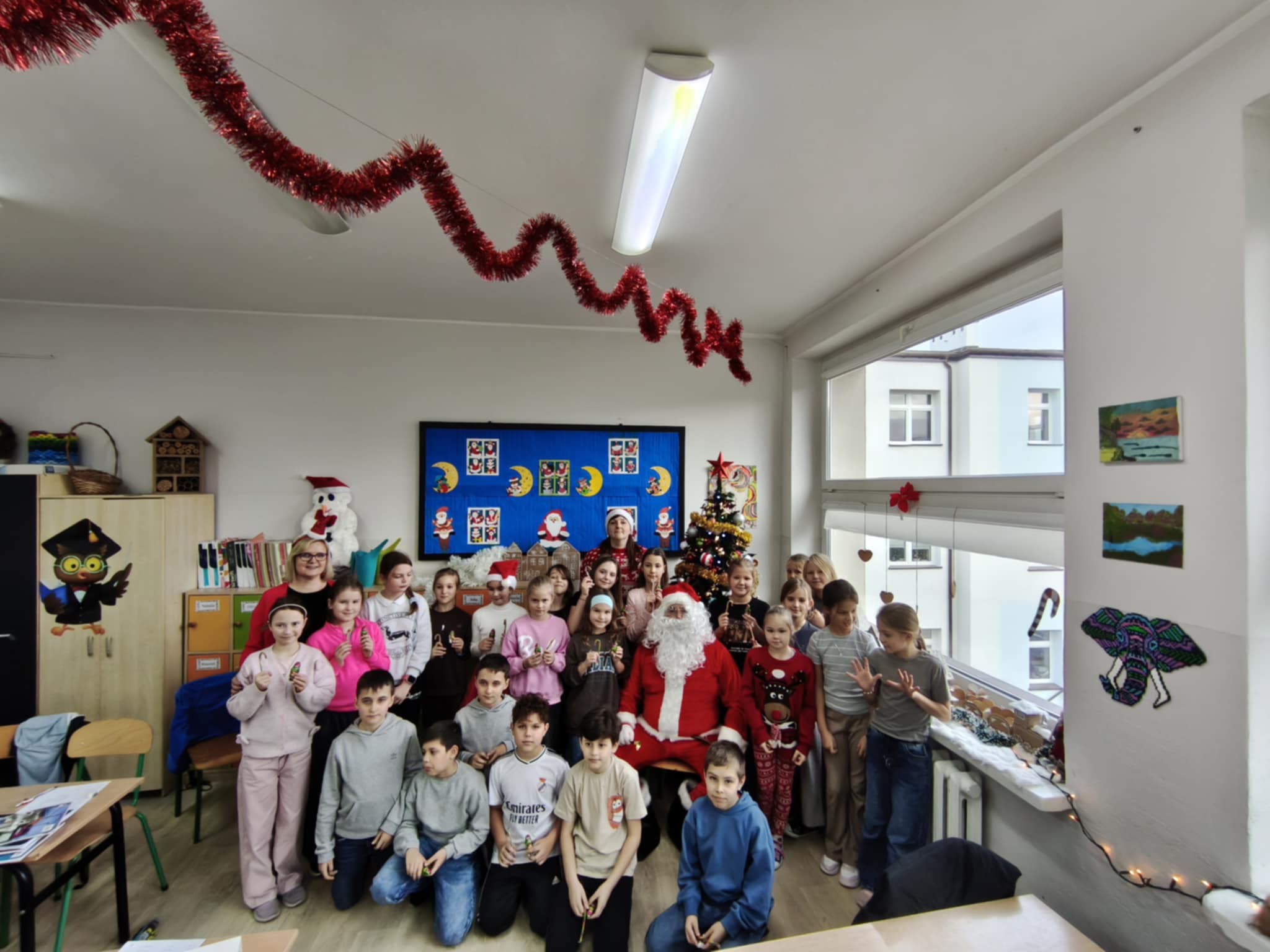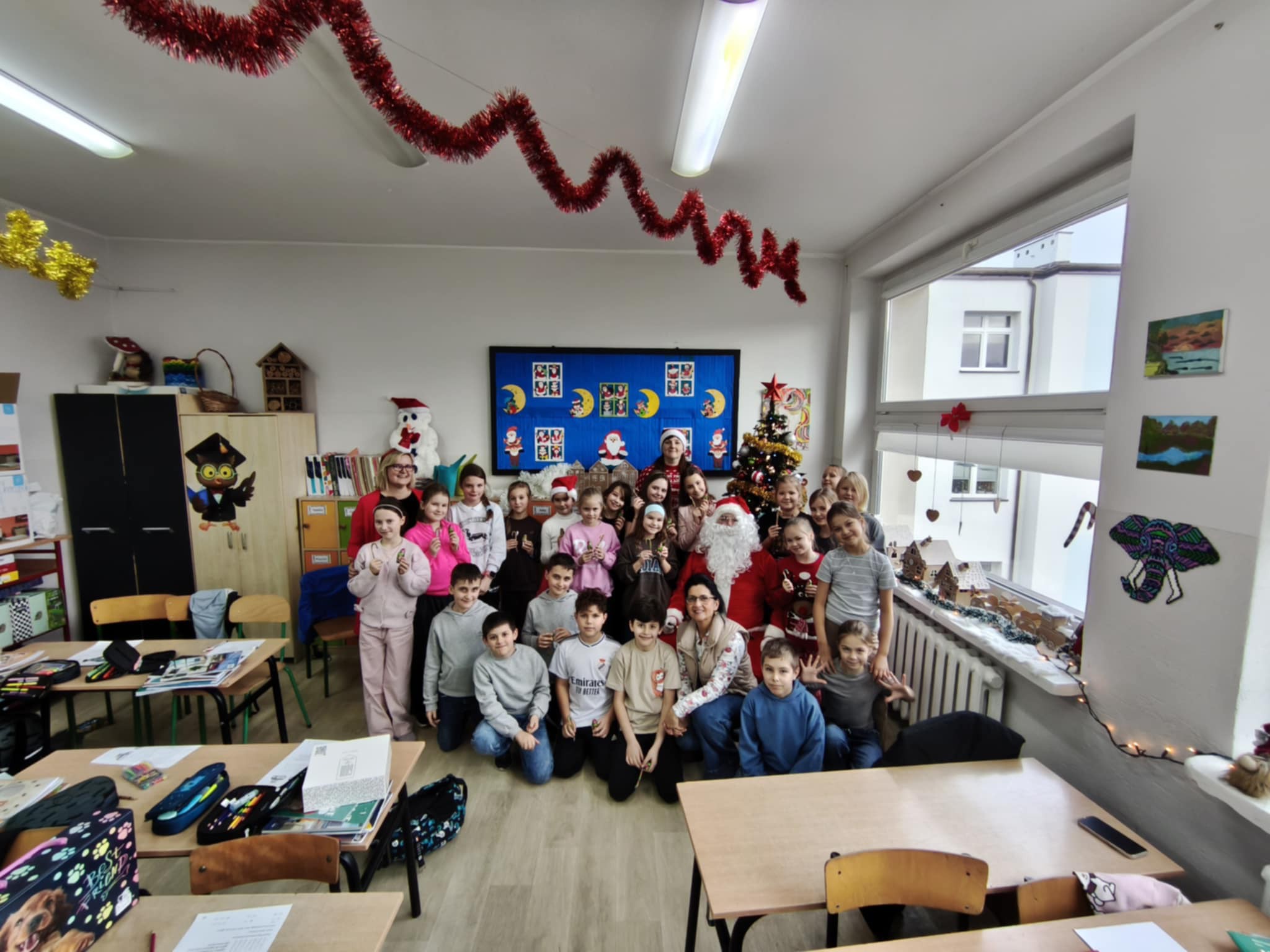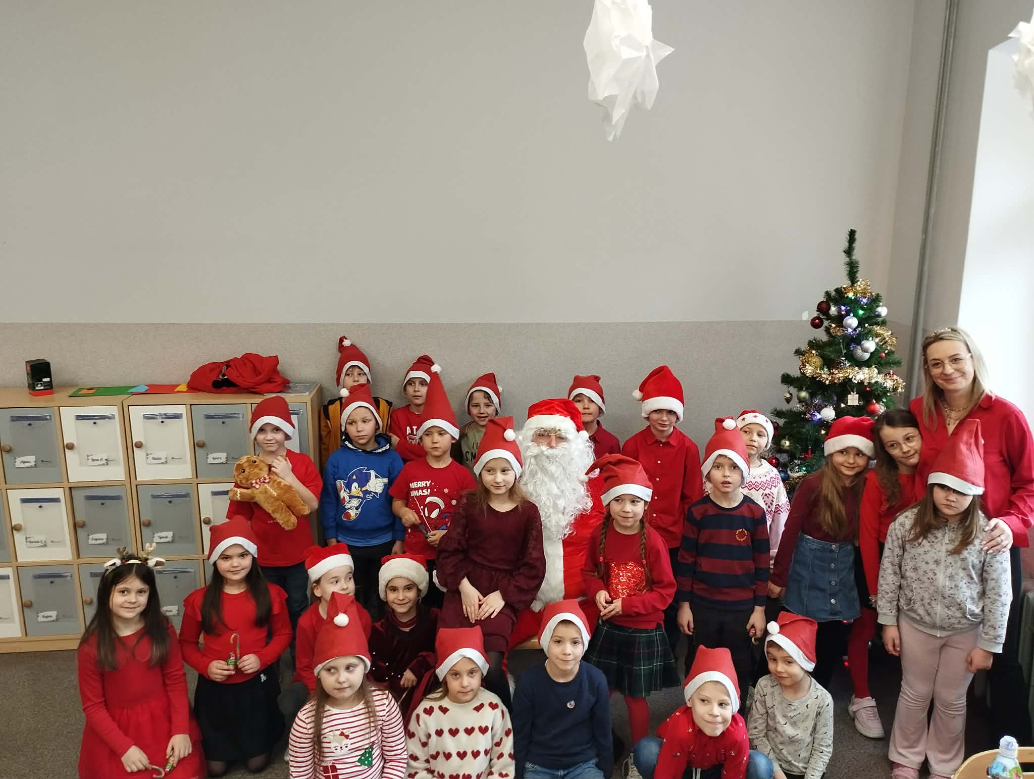 Jak się później dowiedzieliśmy, Mikołaj otrzymał specjalną wiadomość od Rady Rodziców, że w naszej szkole czekają na niego wyjątkowo grzeczne i uśmiechnięte dzieci… no prawie wszystkie. Niektórym podobno zdarzyło się zapomnieć pracy domowej albo zjeść czyjąś kanapkę, ale Mikołaj przymknął na to oko – w końcu jest dziś w dobrym, świątecznym nastroj.